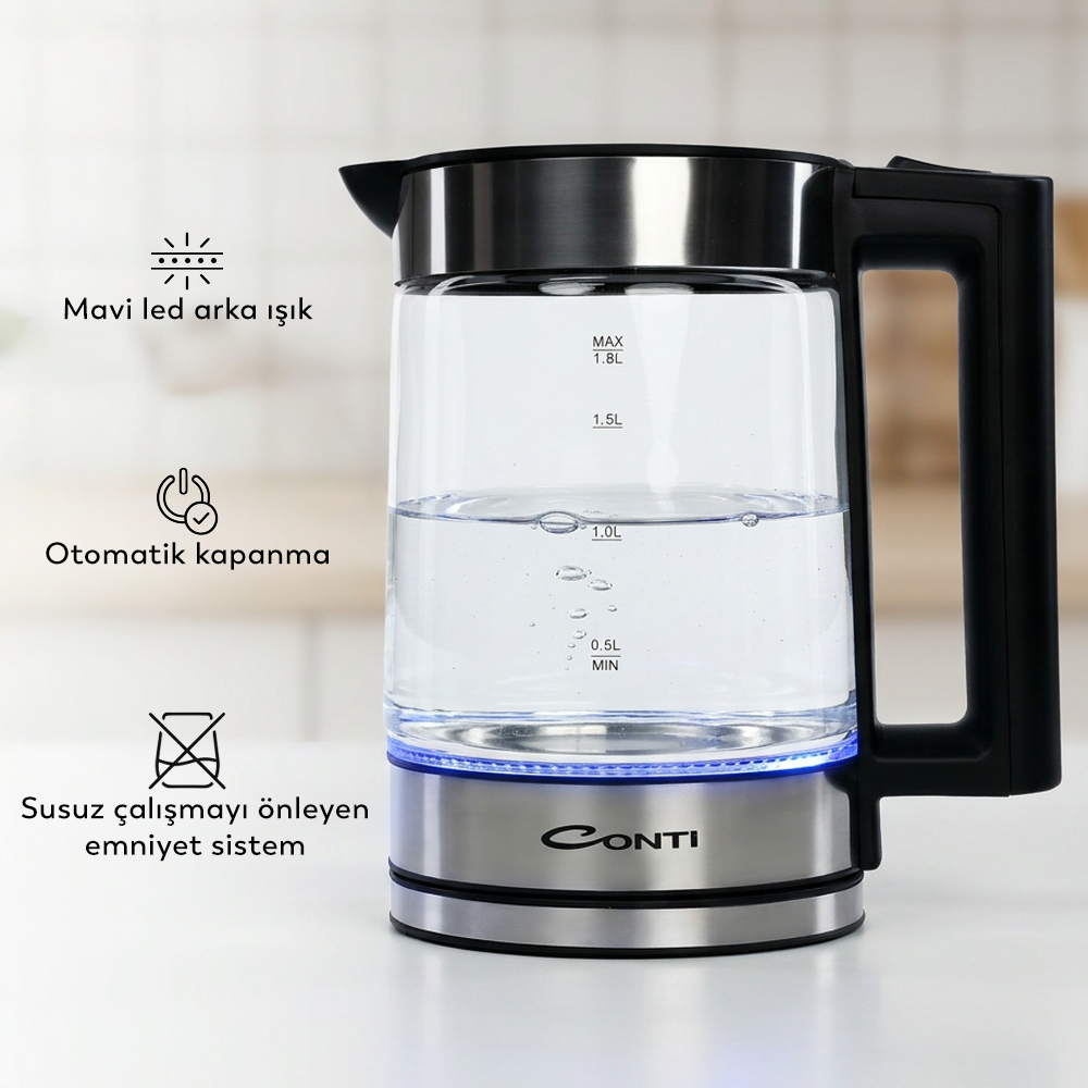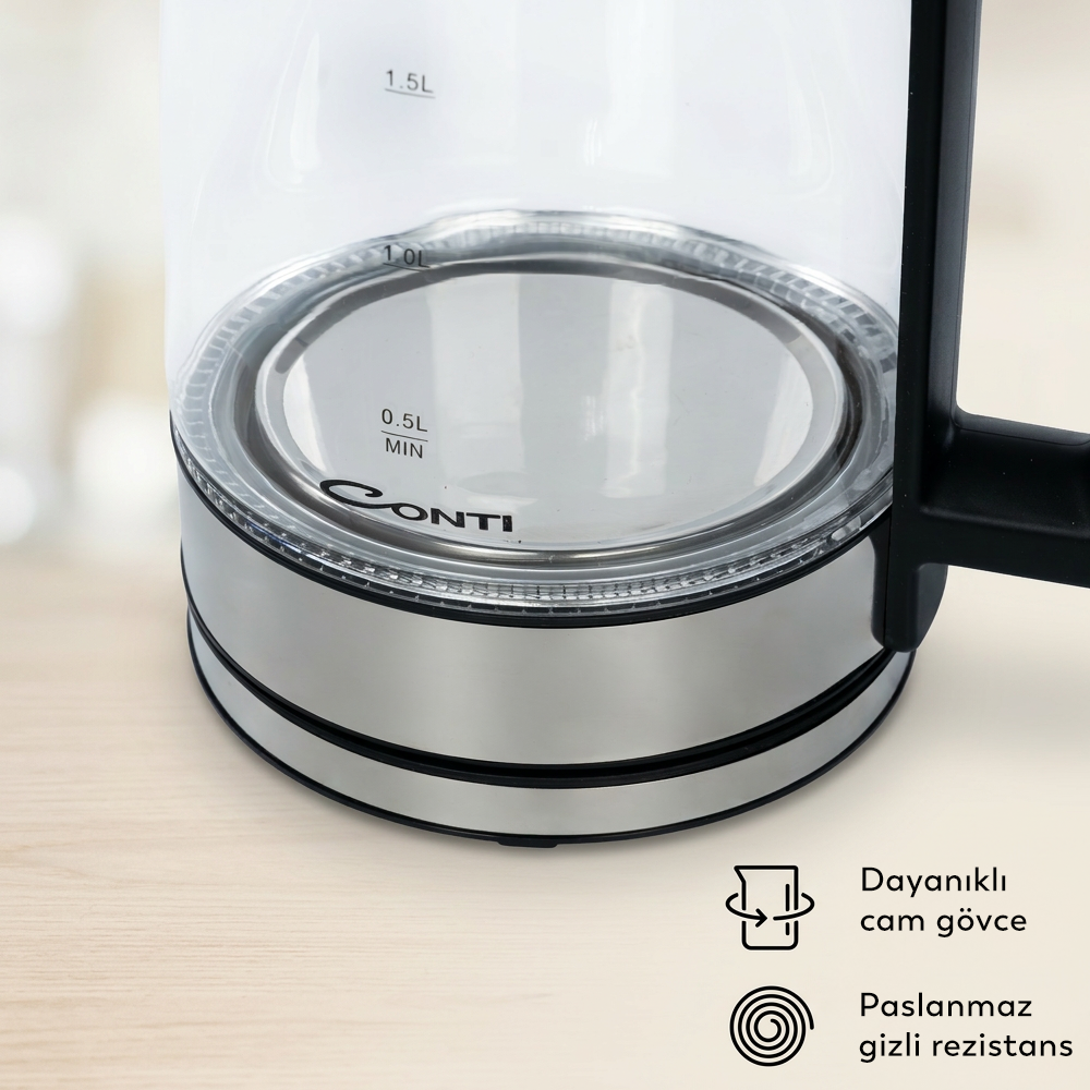 Conti CK-252 Excellent, gold detaylı lüks tasarımıyla mutfak dekorasyonunuza prestijli bir dokunuş kazandırmaktadır. Hızlı kaynatma özelliğiyle zaman yönetimini kolaylaştıran cihaz, paslanmaz çelik iç gövdesiyle suyun doğal tadını korumasına yardımcı olmaktadır. 360 derece dönebilen taban yapısı, hem sağ hem de sol elini kullanan kişiler için ergonomik bir erişim özgürlüğü sağlamaktadır. Otomatik kapanma fonksiyonu ve aşırı ısınma korumasıyla güvenli bir kullanım alanı oluşturan bu kettle, şıklığı ve performansı aynı gövdede buluşturmaktadır.